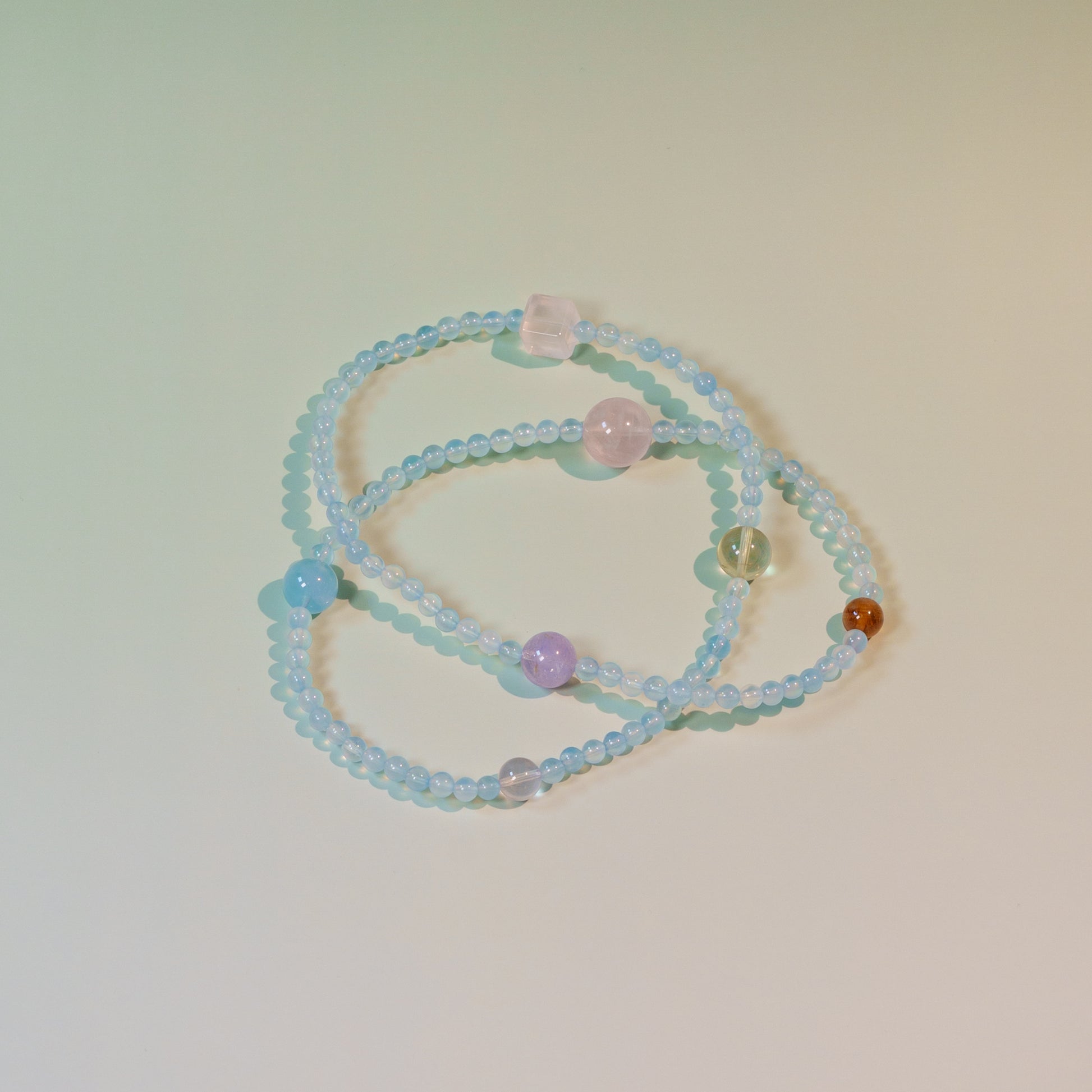 A hand-crafted crystal bracelet made with aquamarine, rose quartz, amethyst and citrine.